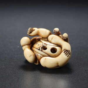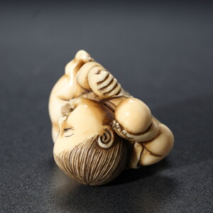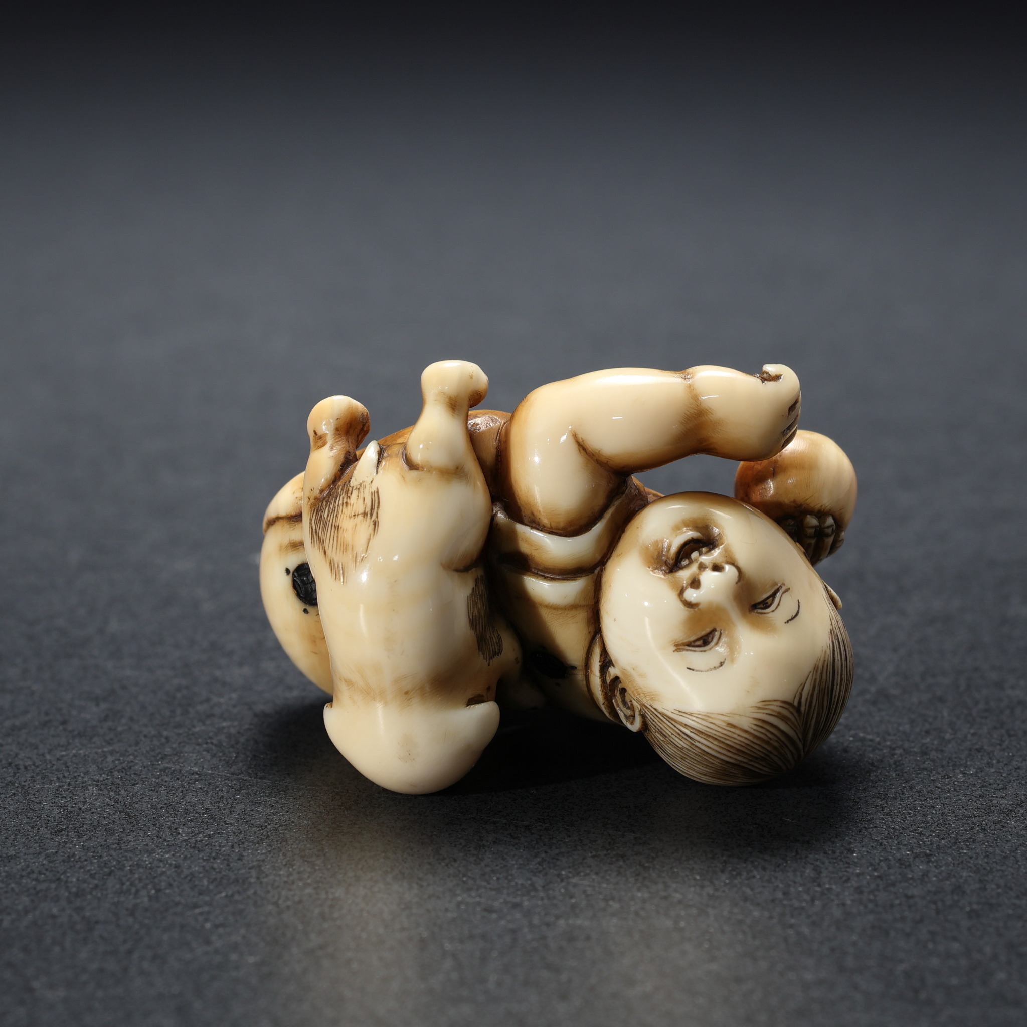 童子と子犬が仲よく戯れる姿を表した、愛らしい根付です。