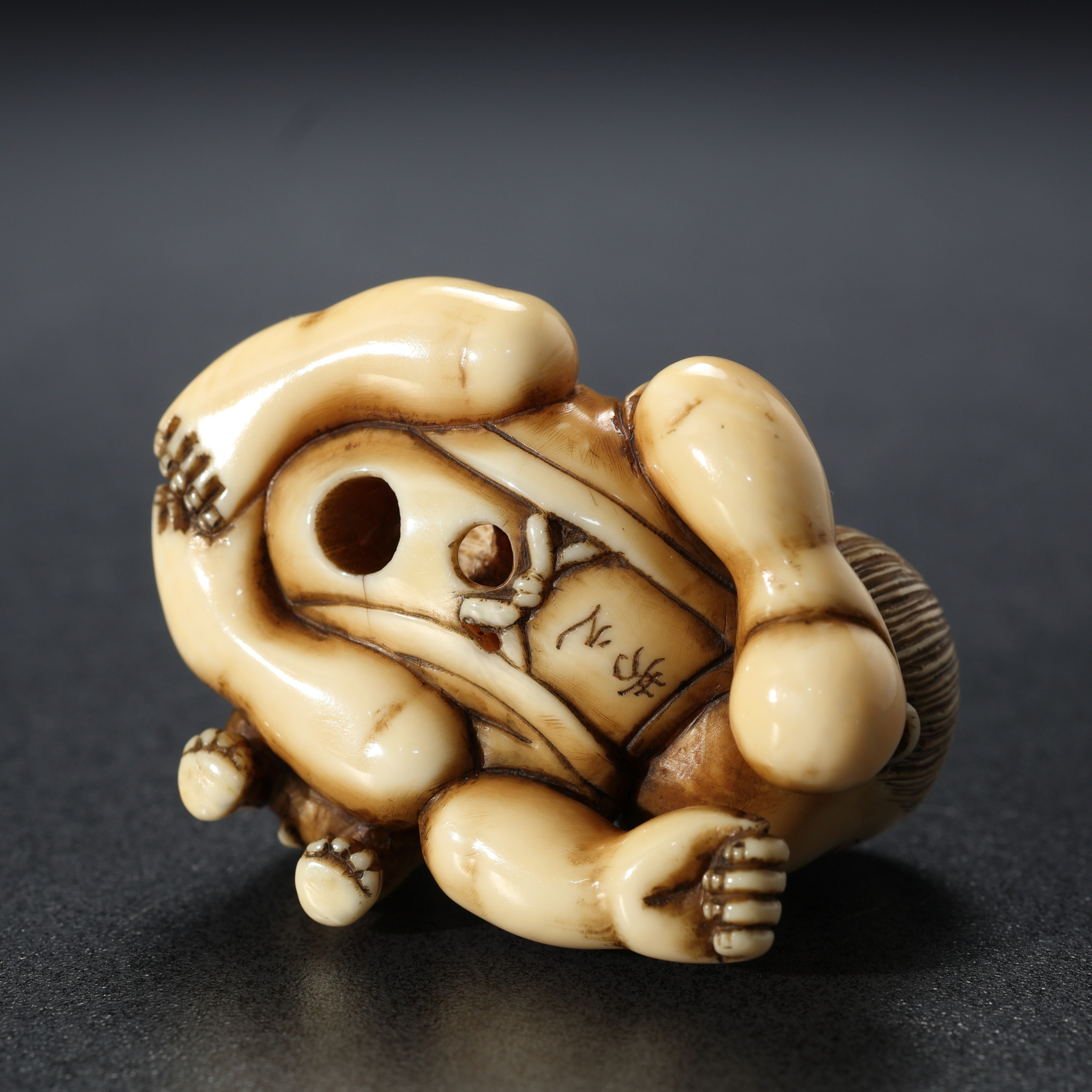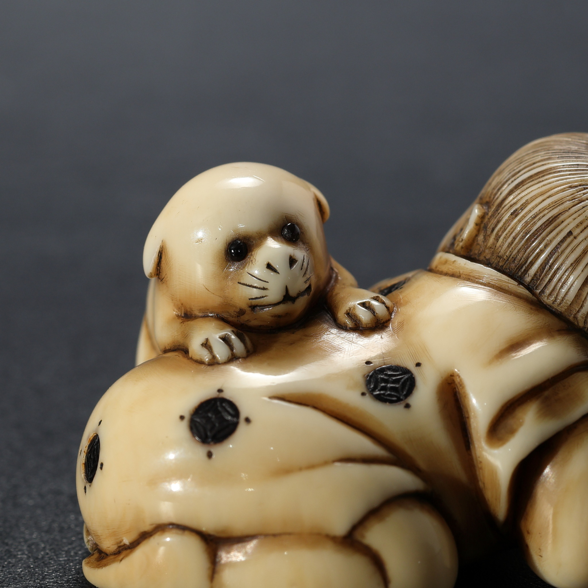 子犬が背に乗ってじゃれつく様子や、童子の無邪気な表情が細やかに彫られており、見ていて楽しい一品です。