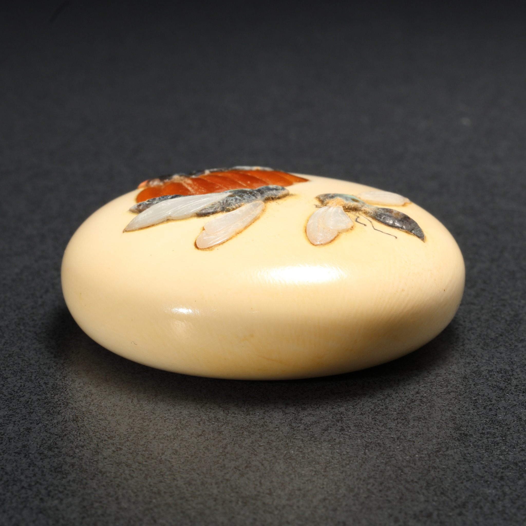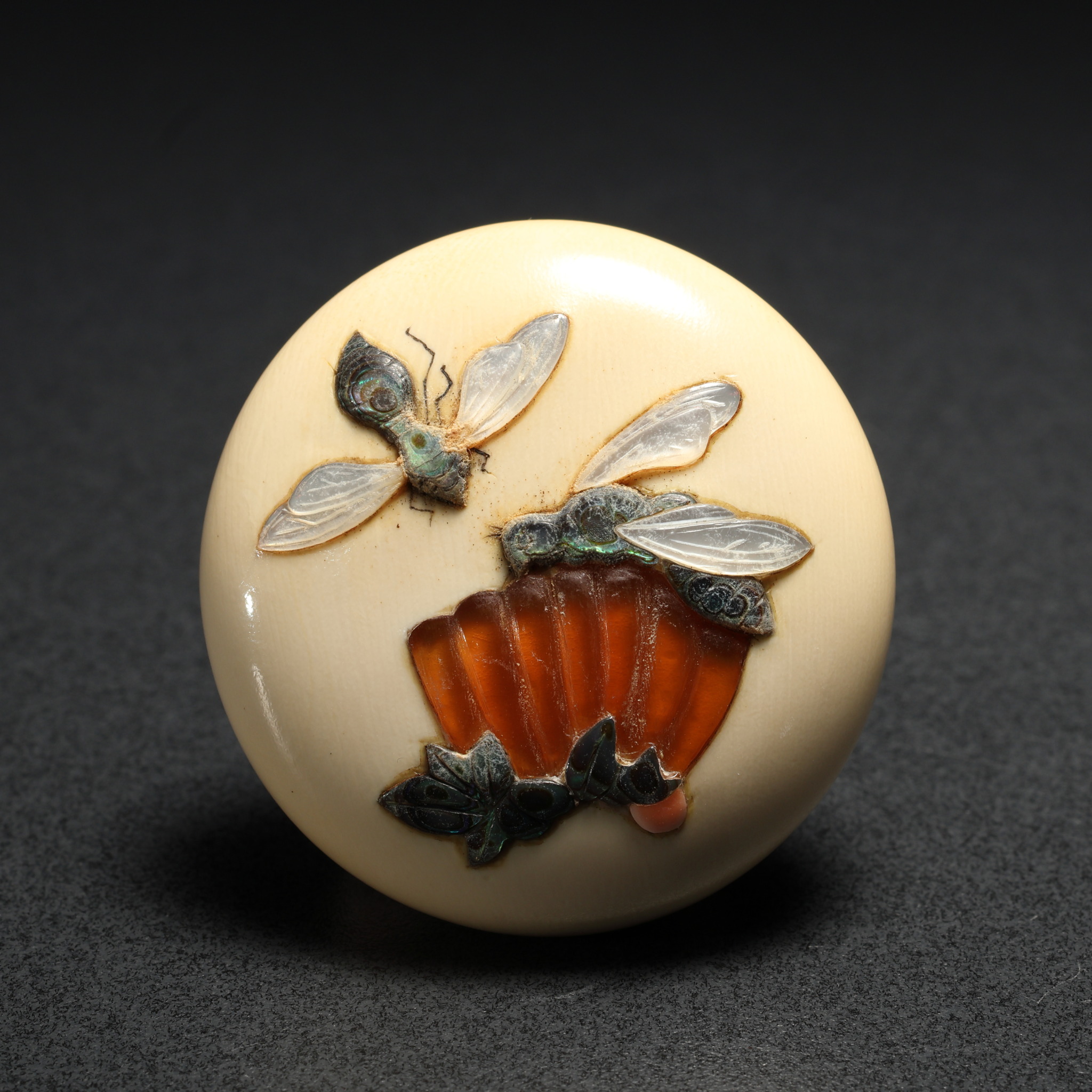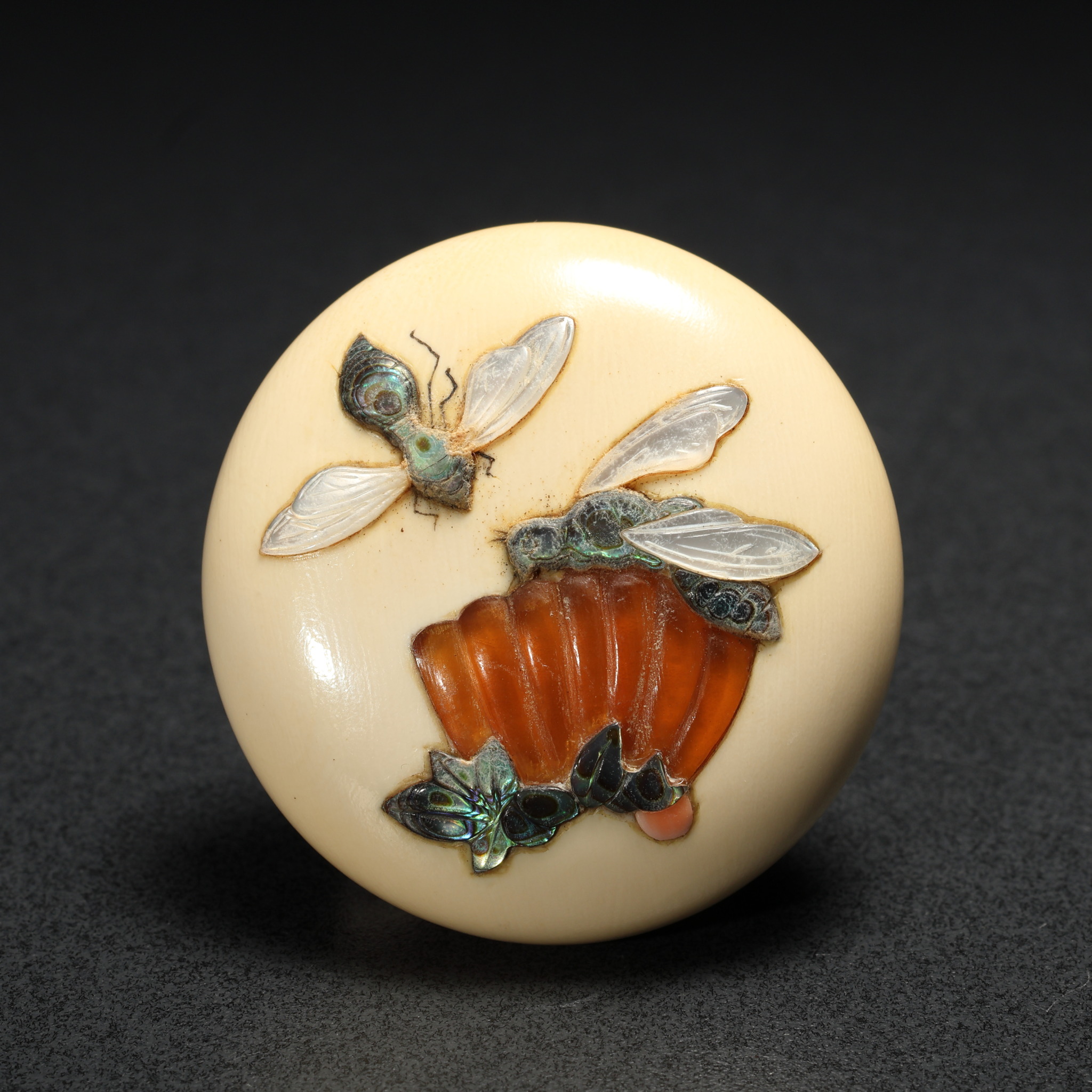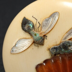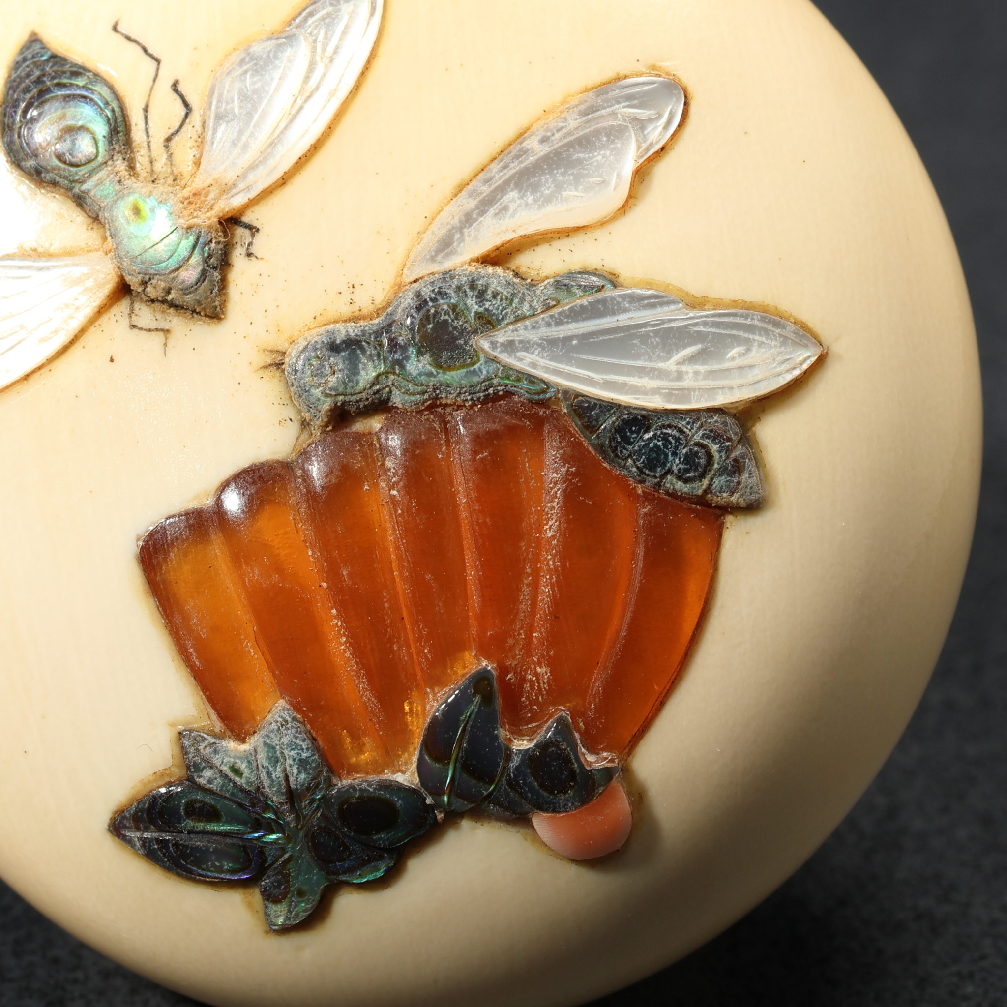 草花と虫の意匠を象嵌であしらった、味わい深い饅頭根付です。
