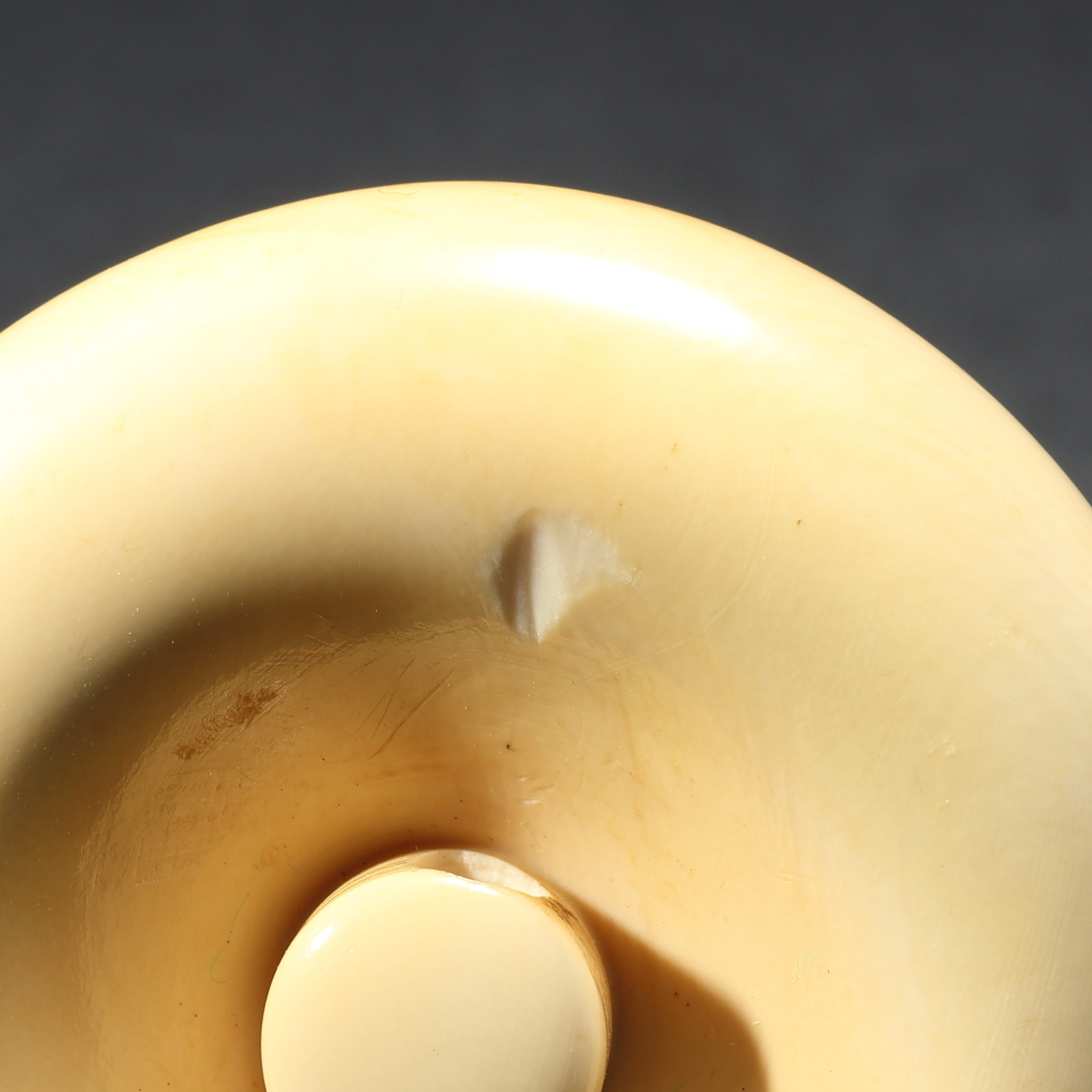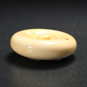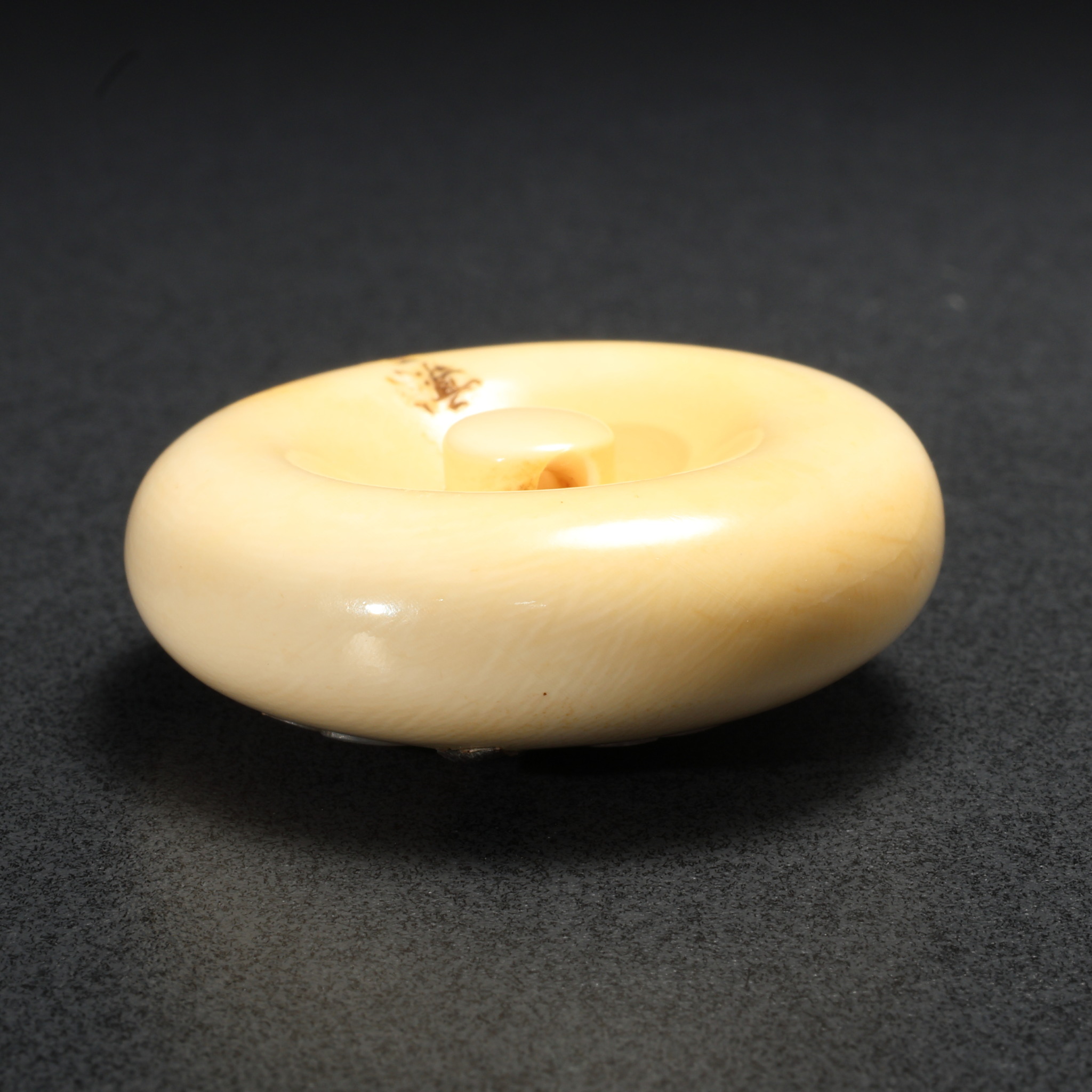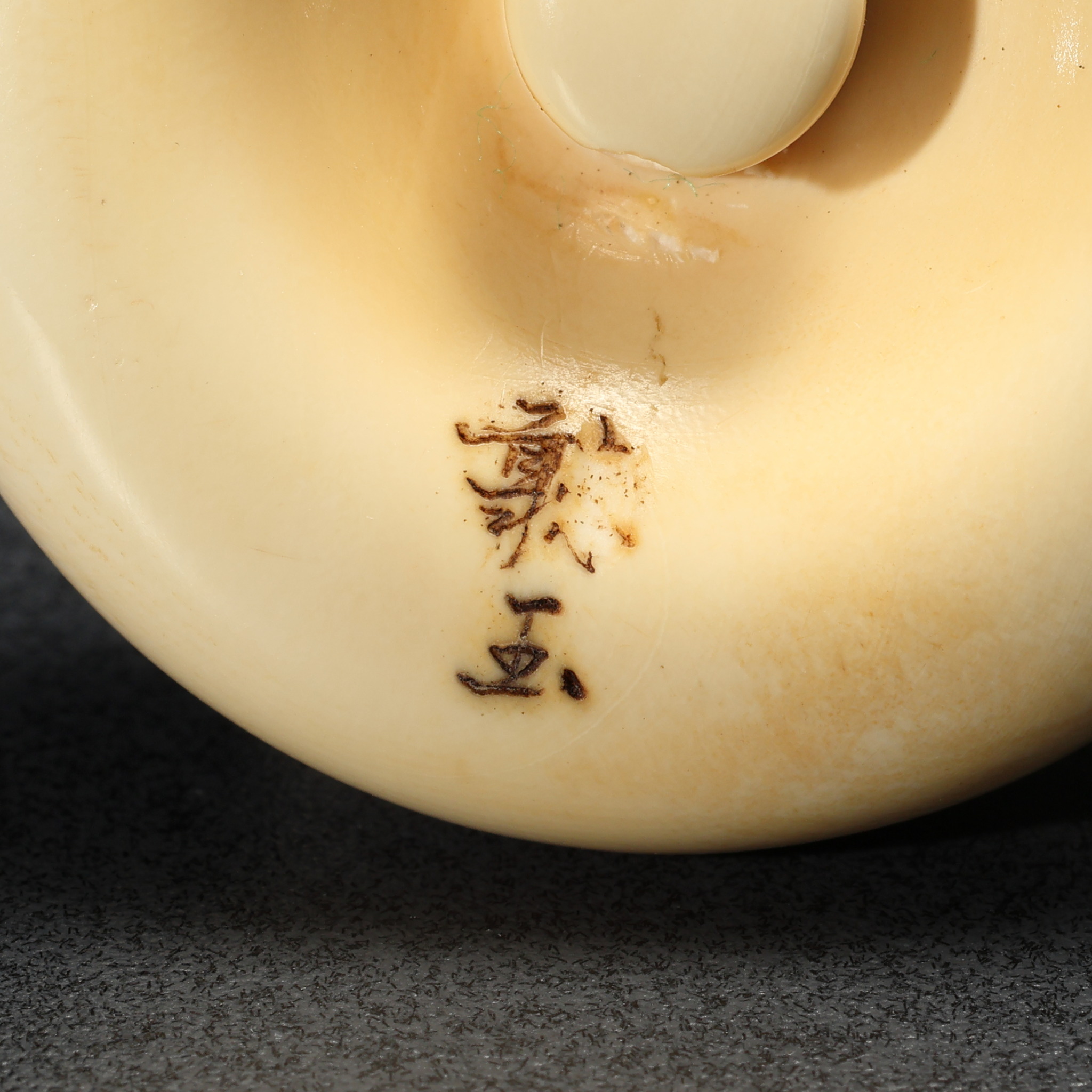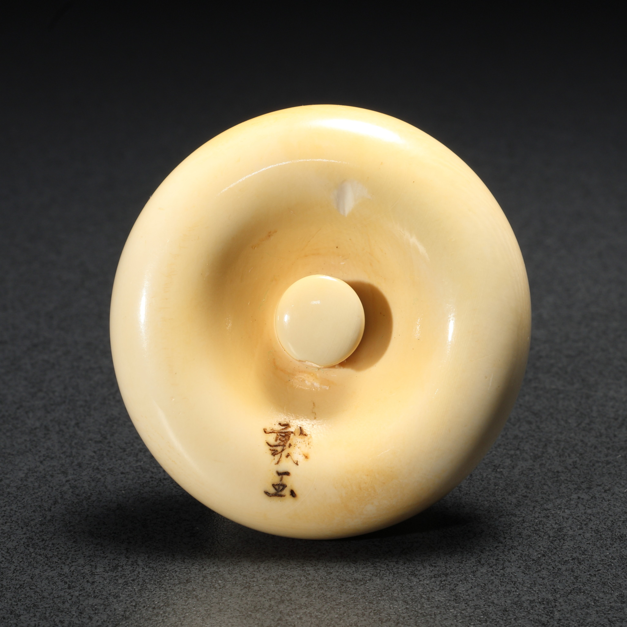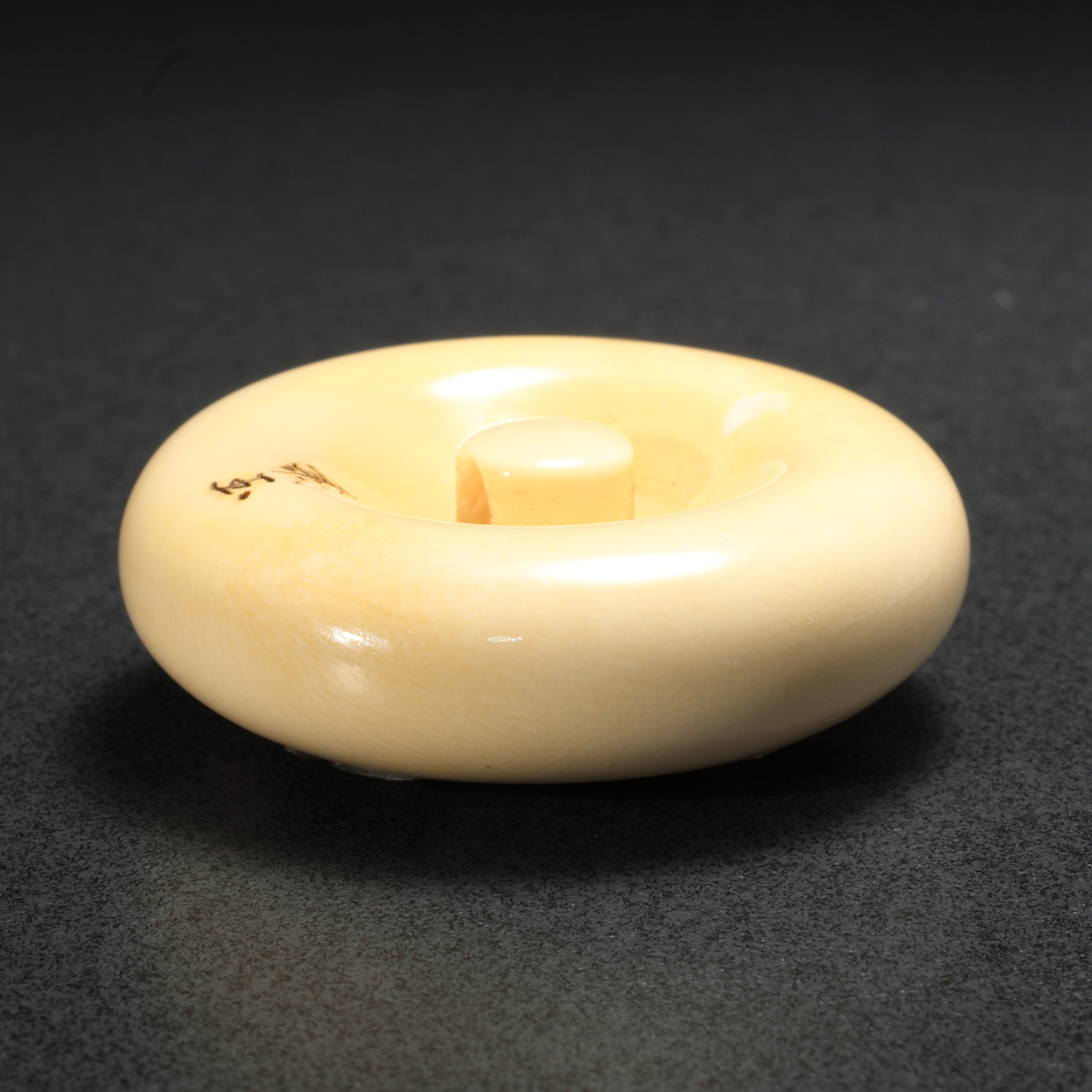 草花と虫の意匠を象嵌であしらった、味わい深い饅頭根付です。