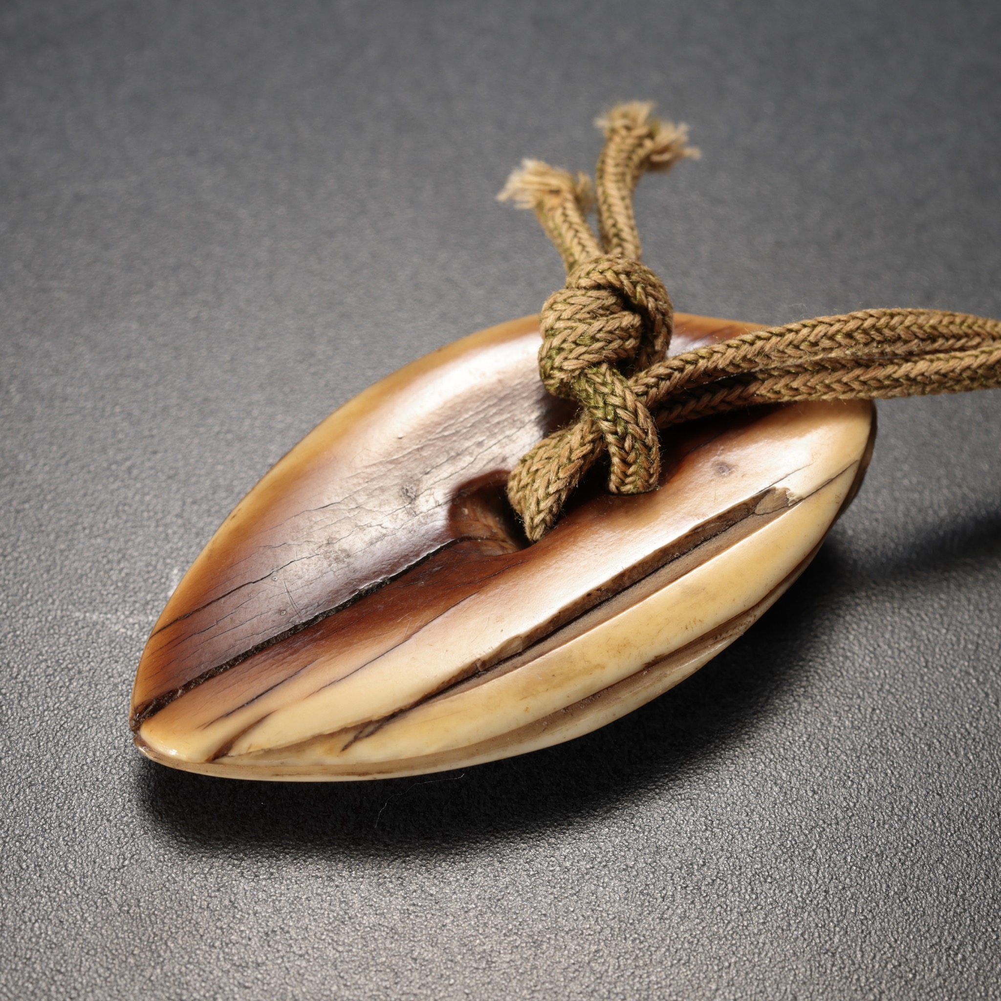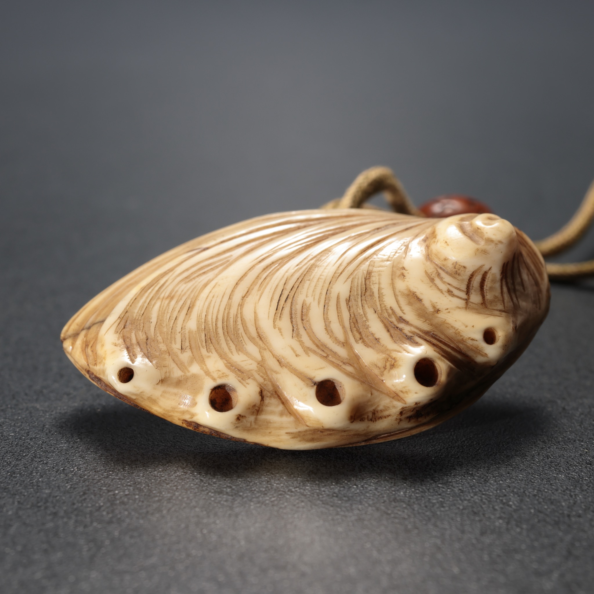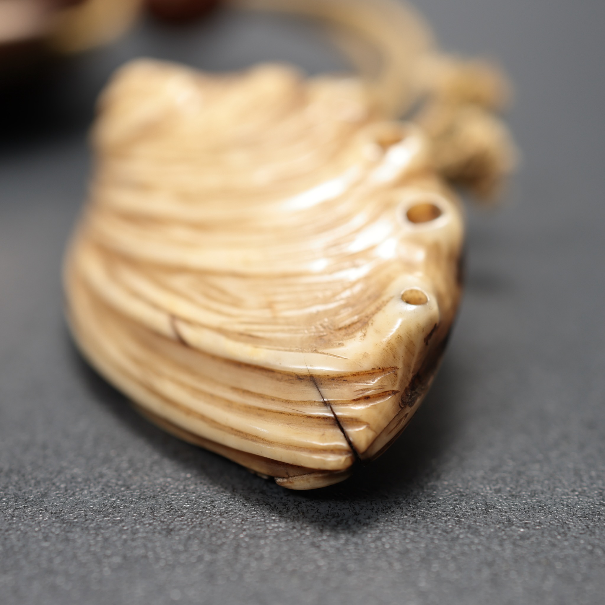 根付は貝をかたどった写実的な造形で、殻の起伏や筋目まで細やかに表現されています。