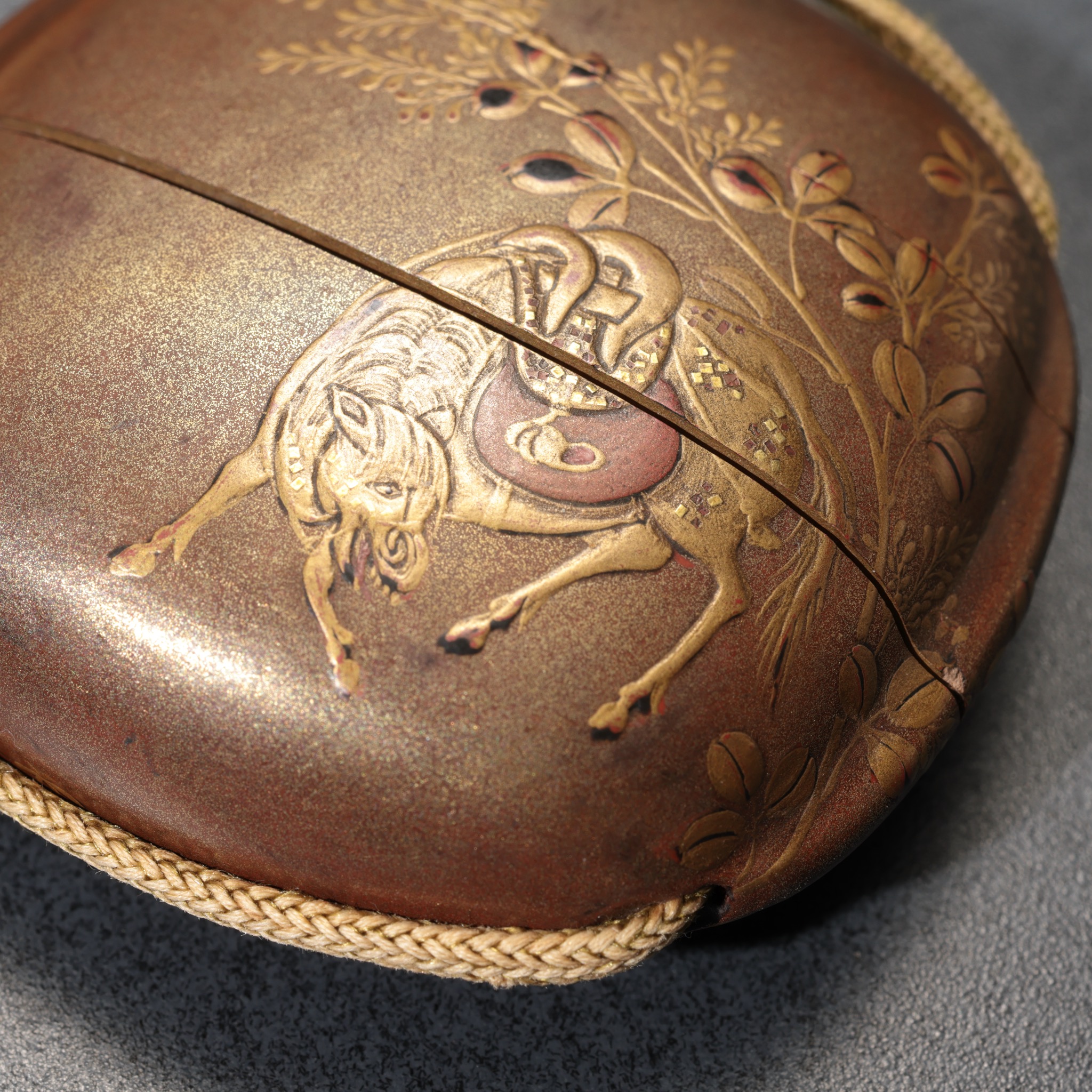 しなやかな肢体や顔つきまで丁寧に表した馬図を配した印籠です。