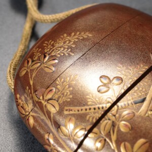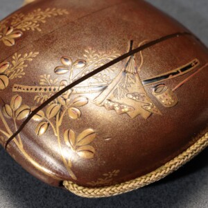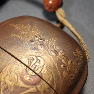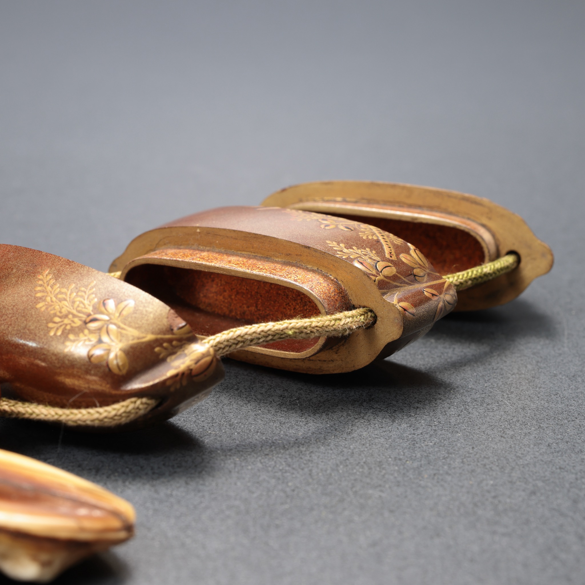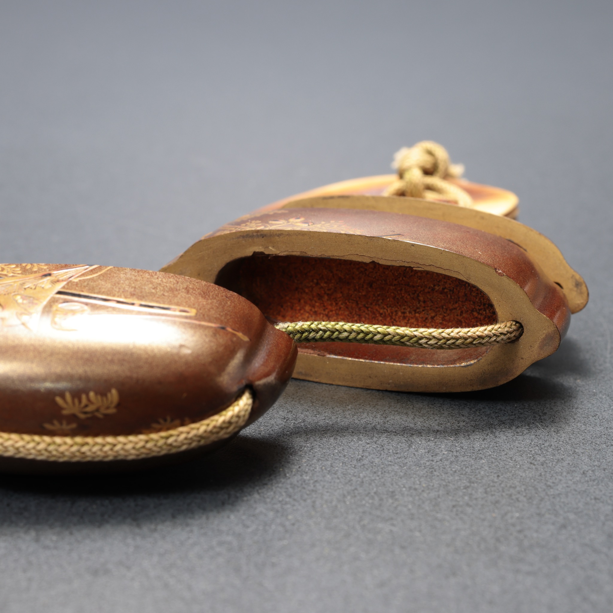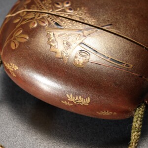 印籠の落ち着いた蒔絵と、貝図根付の取り合わせが洒落味を添え、
